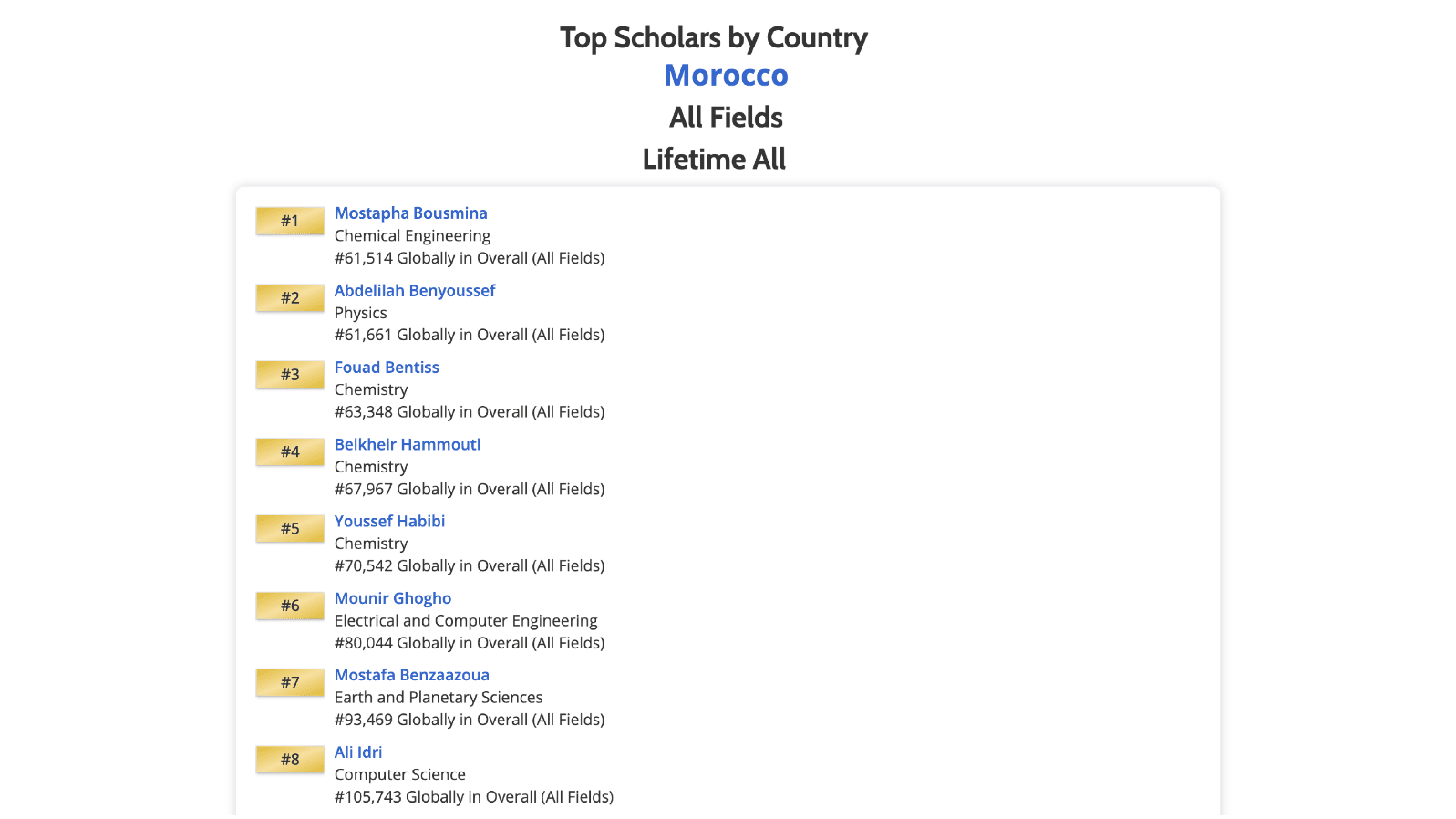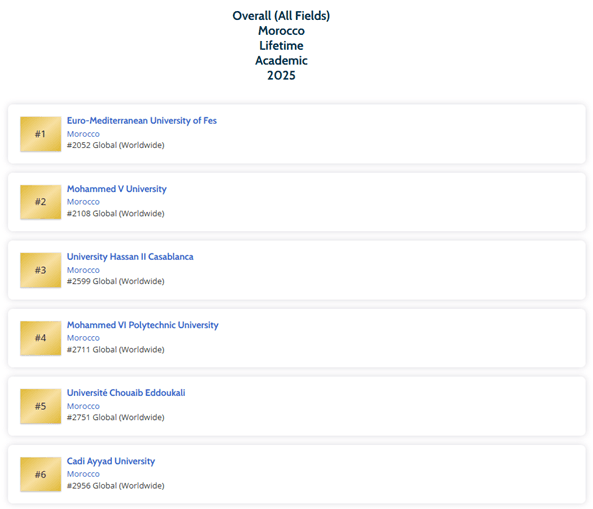 Le classement Top Scholars by Country – Morocco (All Fields, Lifetime) consacre plusieurs chercheurs marocains, dont deux affiliés à l’Université Euromed de Fès. Les chercheurs marocains classés par International ScholarGPS sont :